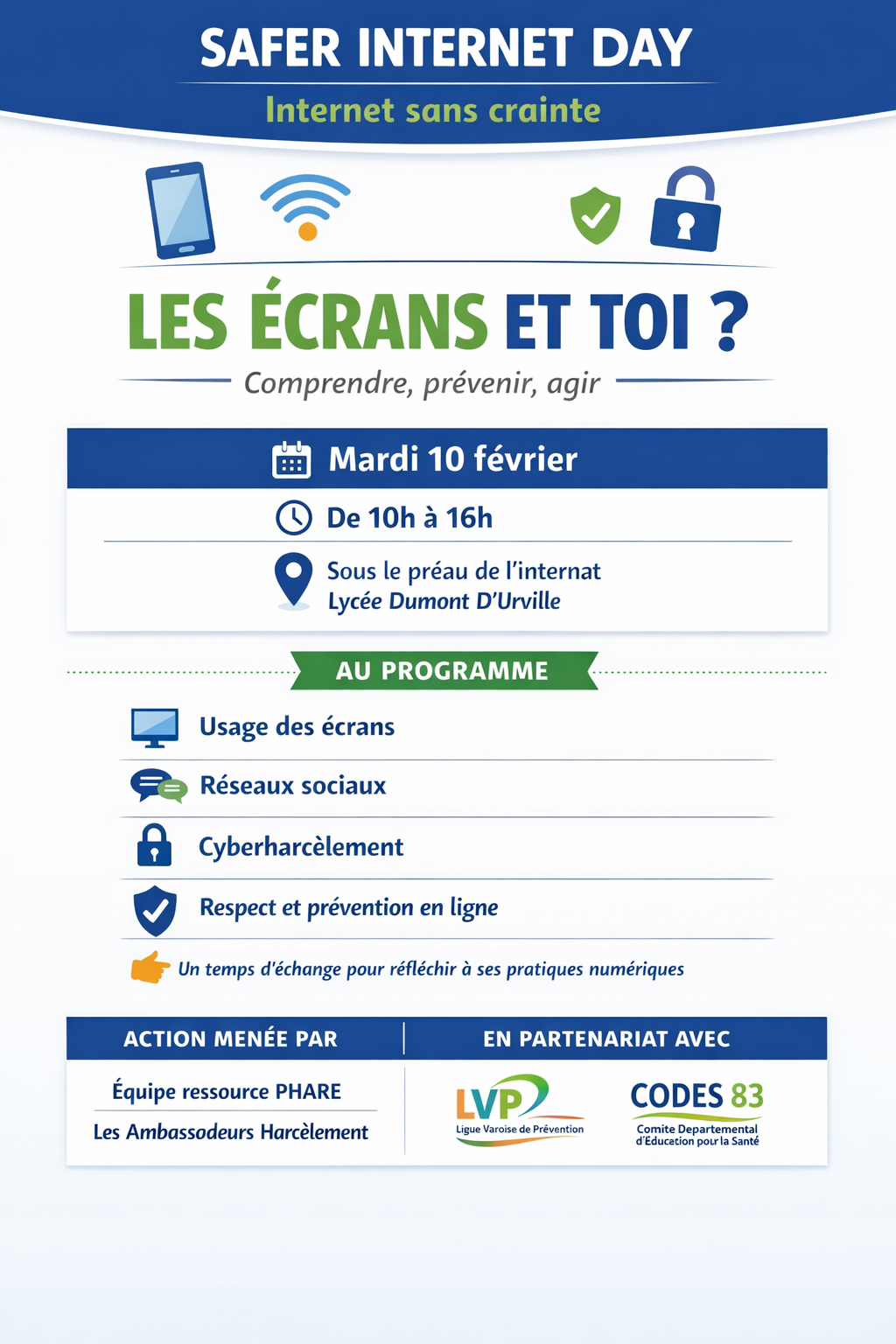 Le 25 novembre 2025 a eu lieu la Journée Internationale de lutte contre les violences faites aux femmes. Les élèves du CVL ont tenu un stand de sensibilisation avec un quiz reprenant des chiffres marquants (156 féminicides en 2025 en France, un viol ou tentative de viol toutes les 2 minutes 30 en France). Les élèves de la Seconde 8 ont réalisé des fresques au sol reprenant les numéros d’urgence gratuits et anonymes : le 3919 pour les femmes victimes de violence, le 119 pour l’enfance en danger.